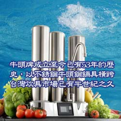 牛頭牌成立至今已有53年的歷史,以不銹鋼牛頭鋼鍋具橫跨台灣炊具市場已有半世紀之久,以專業的研發經驗及經營企業的精神,製造一台能夠世代相傳的真水淨水機(buffalo-water),全機不銹鋼原材,給消費者「一台真水機,三代免換機」的真心保證,具man'; mso-hansi-font-family: 'times new roman'">商品安全有保障